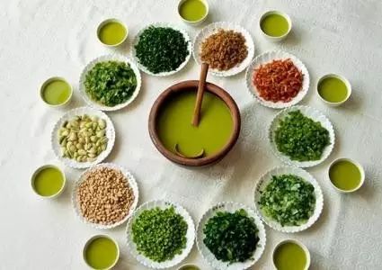 擂茶用特制的瓦瓷擂钵,钵内留有凹纹,取山上木质匀密的山仓树做成擂茶棍。擂茶的原料是茶叶、炒熟的花生、芝麻、香菜、薄荷,这些东西依次放入擂钵中擂碎,味道香浓四溢之时即可停下,放少许盐,把煮开的水倒入,这样,茶就擂好了。擂茶可以根据四季的变幻选择不同配料,春夏湿热,常用新鲜艾叶、薄荷叶;秋天风燥,多选金盏菊或白菊花、金银花;冬天寒冷,便用桂皮、肉柱子、川芎等。