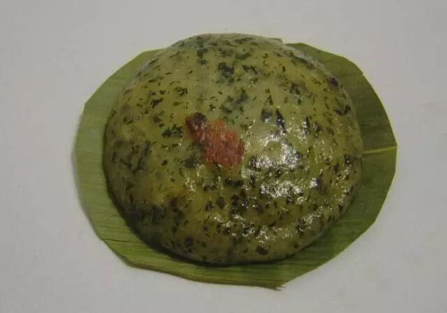 1、摘取新鲜雏嫩苎叶,与适量粳米、糯米和水于石臼捣烂、粘合,形成青翠欲滴的粄团;
