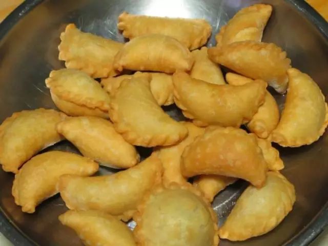 2、把一定比例的面粉、鸡蛋、白糖、猪油加入少许水不断搅拌,再用面杖压成饺子皮样(与北方包饺子相似),把干馅放入面皮捏成饺子样;
