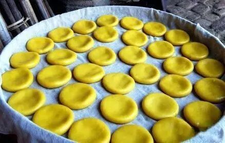 2、粉团分成小团,捏成古钱状,用枋棰制成小饼等状;