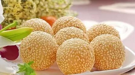 4、煎丸有包馅与不包馅的两种。做不包馅的煎丸直接取面团揉成圆形或椭圆形摆放在盛具里,沾上一层芝麻,让芝麻牢牢粘满小粄团表面;做包馅的煎丸,将其捏薄后取事先准备好的馅包裹成圆锥形、三角形或扇形的煎丸待炸;