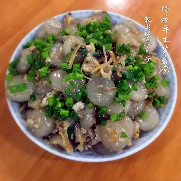 5、将沥干水的算盘子下锅翻炒,一定要放鱼露,这样才能保证大埔的原汁原味,大火翻炒两三分钟后散上葱花即可。