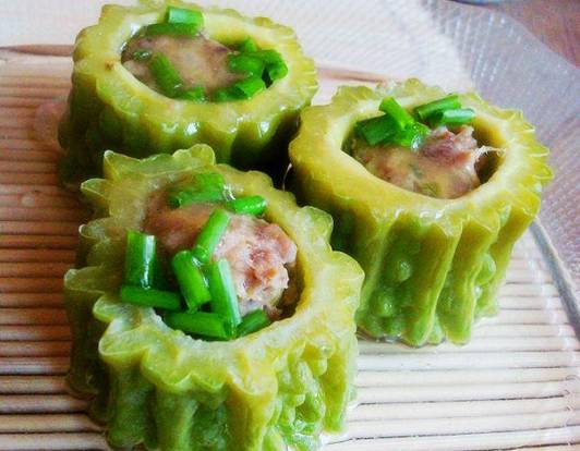 2、将苦瓜墩空心填满肉馅,摆入盘内,入笼急火蒸熟,取出备用。