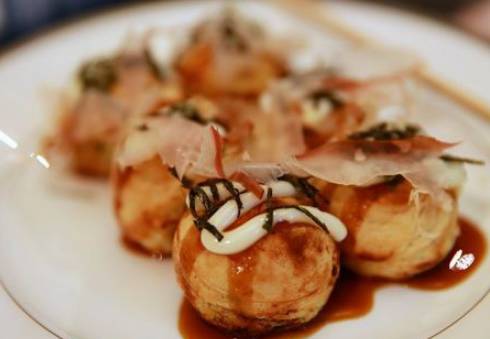 9、不停翻动每个丸子,等颜色呈现出金黄色的时候就可以了,做好的丸子先挤上层照烧酱,然后挤上沙拉酱,再撒上海苔碎,最后撒上木鱼花,开吃