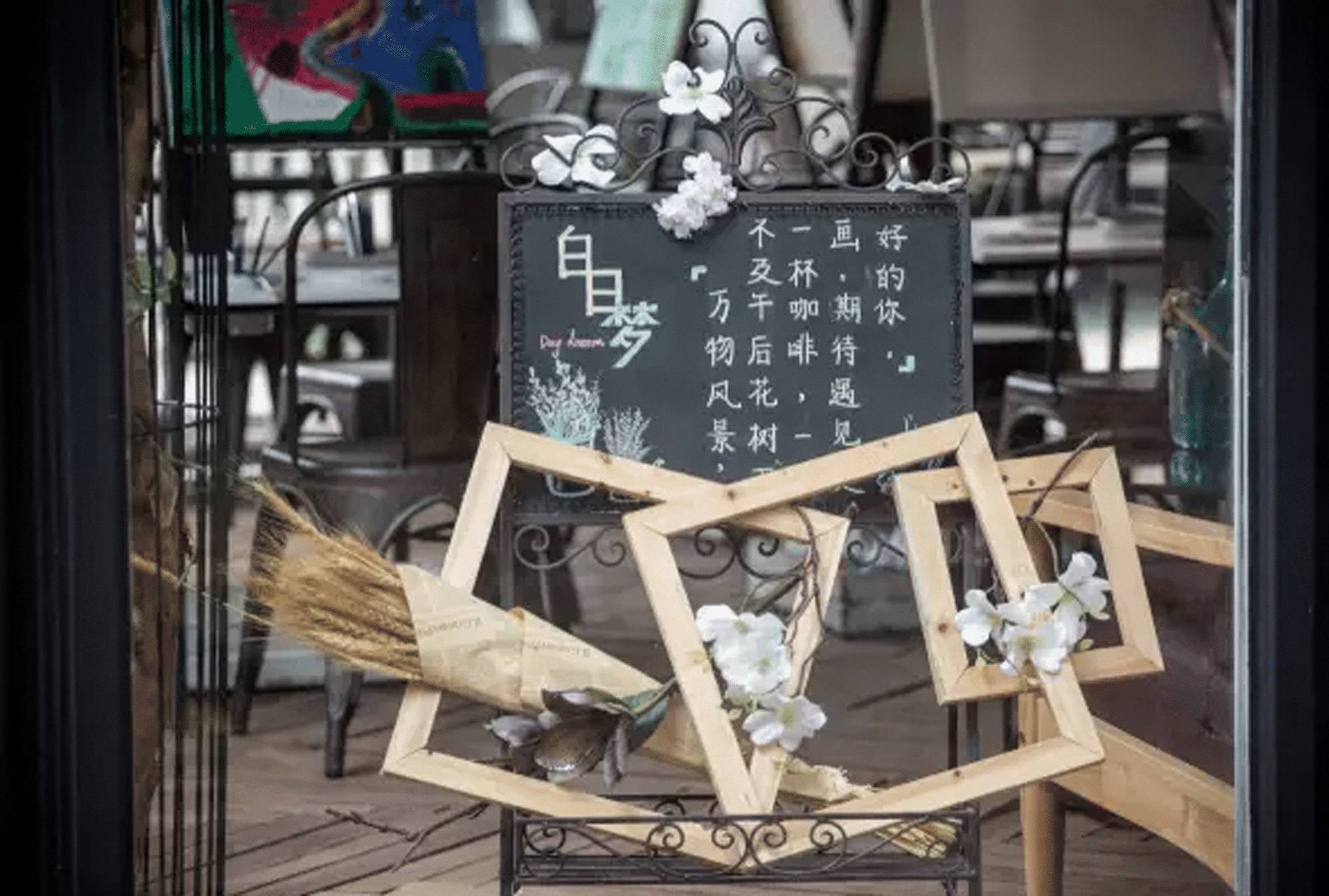 园区内,各式小店随意的散落在各处。【白日梦】是家咖啡画廊一体店,开放的空间给人以自由,现代风的风格很简约。