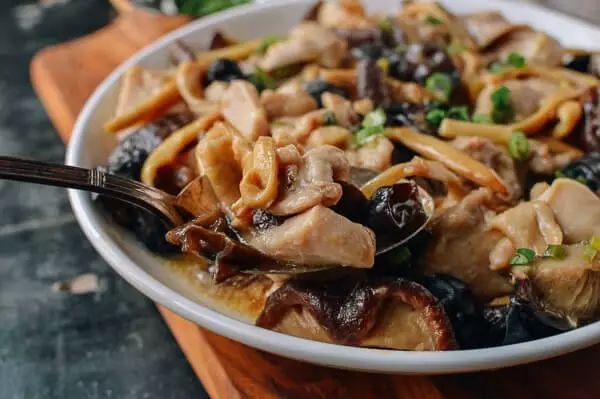 4、然后将浸泡后的香菇、金针菜、木耳倒入鸡肉中,加入玉米粉,搅拌均匀,此时汁水应已被鸡肉充分吸收。