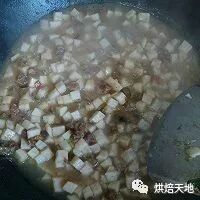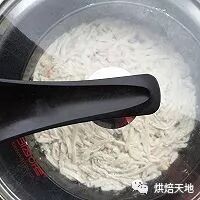 9. 将粘米浆倒入锅中和煮好的芋头腊肠一起拌匀