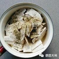 5. 烤箱预热。香芋片码放在烤盘上, 200度、15分钟左右。烤的时间,应该和香芋片的厚薄有关。注意观察,不要烤焦了。