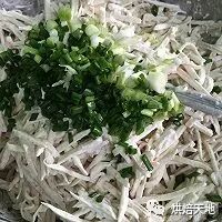 4. 拌10分钟左右,芋头丝出现粘性,加入葱花再次搅拌均匀即可