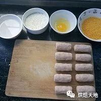 5. 包好的芋头卷依次先过清水,裹面粉,再裹鸡蛋液,最后裹面包糠。想芋头卷好吃,面粉不要裹太厚,依次裹完之后再重复裹一次鸡蛋液和面包糠。