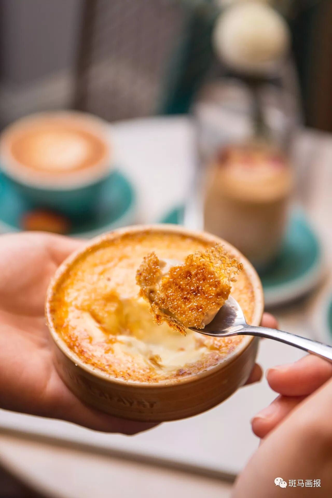 现点现做!装在陶瓷碗里白嫩的法式炖蛋,铺上糖,用火焰喷枪融化,琥珀色的焦糖立马呈现,一定要趁热吃!