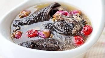 做法:乌鸡洗净切块,用沸水焯一下待用。锅内加适量水、盐、味精、鸡精,下入乌鸡块、茯苓、当归,小火煲3小时左右即成。