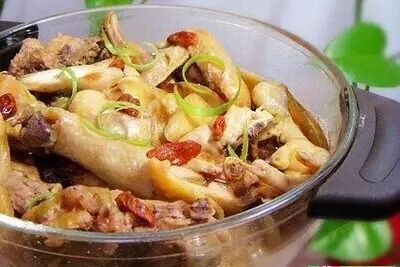制法:将母鸡剁成3厘米见方的块,放入沸水锅内烫3分钟捞出,洗净血沫,装入汽锅内,加入姜、葱、盐等调料,再将洗净切好的黄精、党参、淮山药放入,上笼蒸3小时即可。