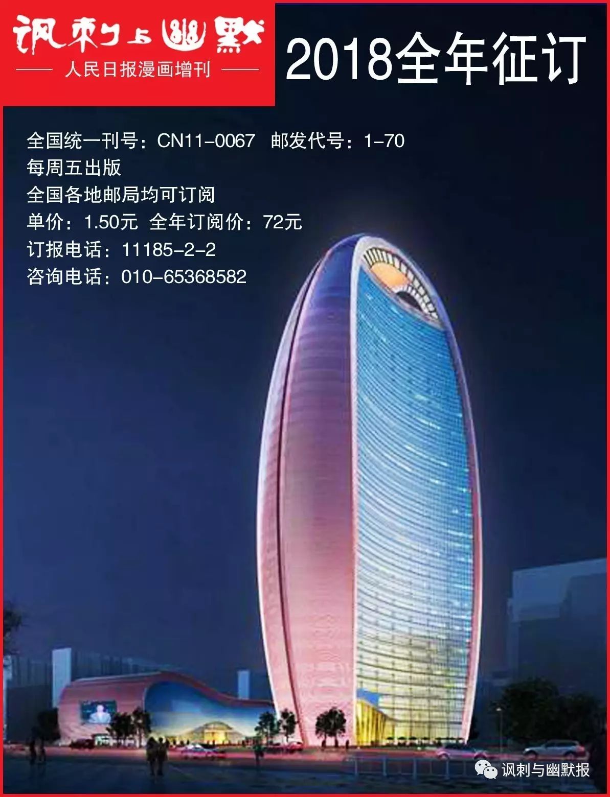 ●《讽刺与幽默报》,是人民日报漫画增刊,创刊于1979年1月20日,是全国目前唯一以漫画为主要表现形式的报纸。华君武、丁聪、方成等著名漫画大师都曾在这里漫画社会,幽默生活,漫画家们雅俗共赏、老少皆宜的作品在这里与大家见面。《讽刺与幽默报》现为周刊,每周五出版,内容丰富多彩,有社会热点、生活漫画、国际风云、外国幽默、开心部落、智慧画语、众生相等多个知名栏目。《讽刺与幽默报》用讽刺的笔调揭露弊端、剖析社会,用幽默的方式品味生活、思考人生。阅读《讽刺与幽默报》,可以开始轻松快乐的智慧之旅。