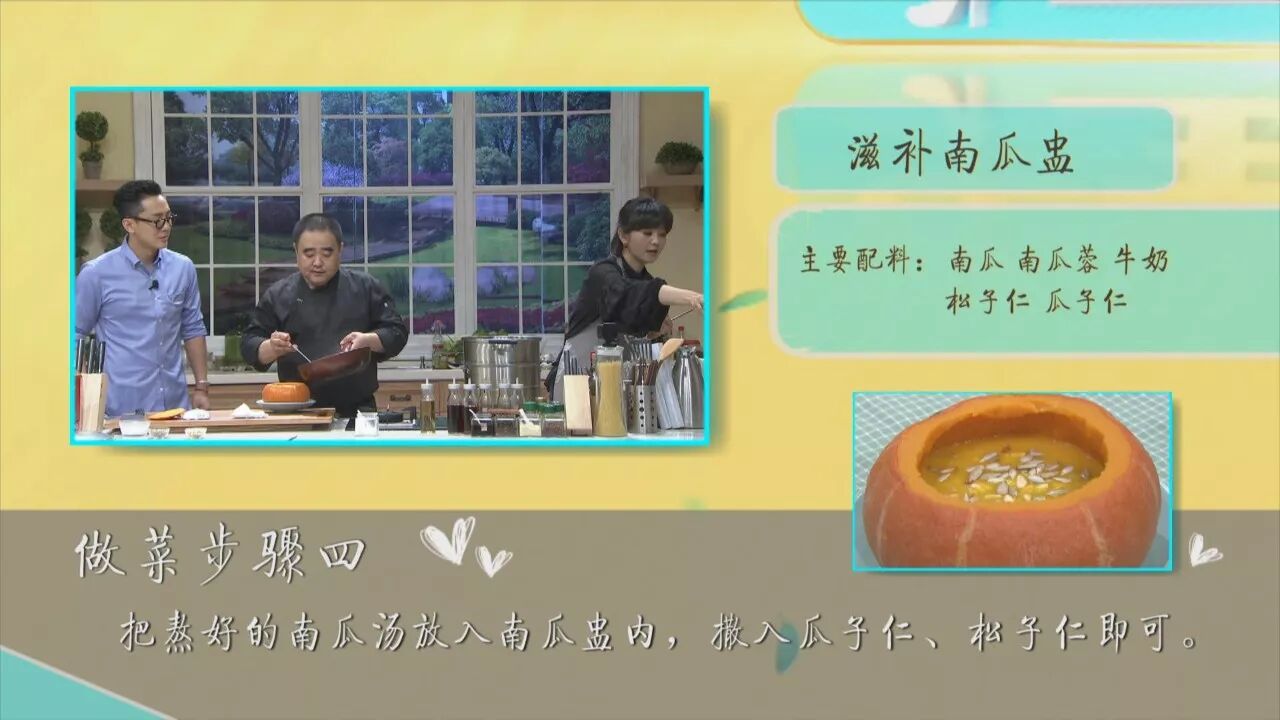 把熬好的南瓜汤放入南瓜蛊内,撒入瓜子仁、松子仁即可。