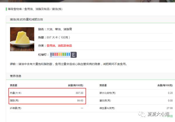从图中可知,如果你要做15个蛋黄酥,那么就需要酥皮中的46克酥油或者猪油+油酥中的46克酥油或者猪油,那么也就表示一个蛋黄酥的酥皮+酥油部分达到了6克的油(以100g脂肪含量99.2来计算脂肪5.95克),根据以下猪油的热量和脂肪含量,可得出光油皮+油酥的油脂就达到了53.82大卡!另外猪油的饱和脂肪以及反式脂肪也是高的吓人!还不包括面粉、砂糖、红豆沙和蛋黄,更有甚者再加个拉丝的麻薯!