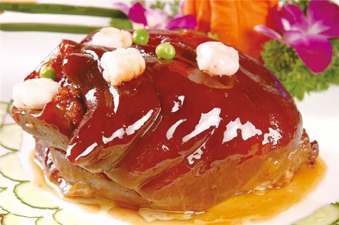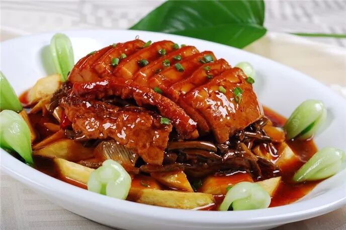 肘子,有前肘和后肘之分。其中前肘因其皮厚、筋多、胶质重、瘦肉多而更胜于后肘。对肘子有不少烹饪方法,包括:烧、扒、酱、焖、卤、汤等等,将肘子带皮烹制,肥而不腻。