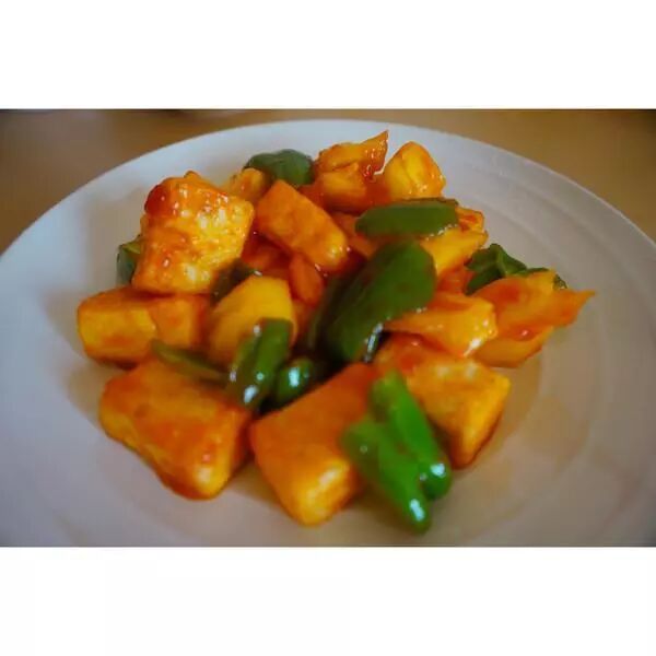 3.将番茄酱、糖、盐、淀粉和水混合调成汁。锅烧热下少许油,下调好的汁炒匀,然后下入青椒和 菠萝翻炒一会,接着下入豆腐一同翻炒,让调料汁均匀裹在菜上即可;