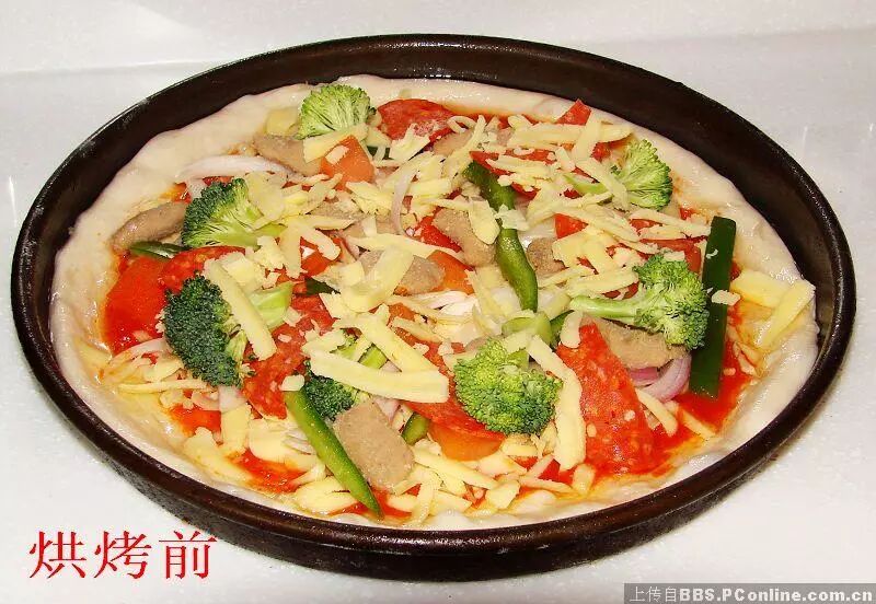 面发酵好后,预热平底锅,锅底铺植物油一薄层,将发好的面平摊在锅底上,面饼上再淋少许植物油,加蕃茄沙司一层,奶酪丝一层,再撒上蔬菜水果类和炒好的牛肉沫和鸡丁的备料,最上层摆匀奶酪丝或奶酪小丁。用小火烙15分钟左右即可
