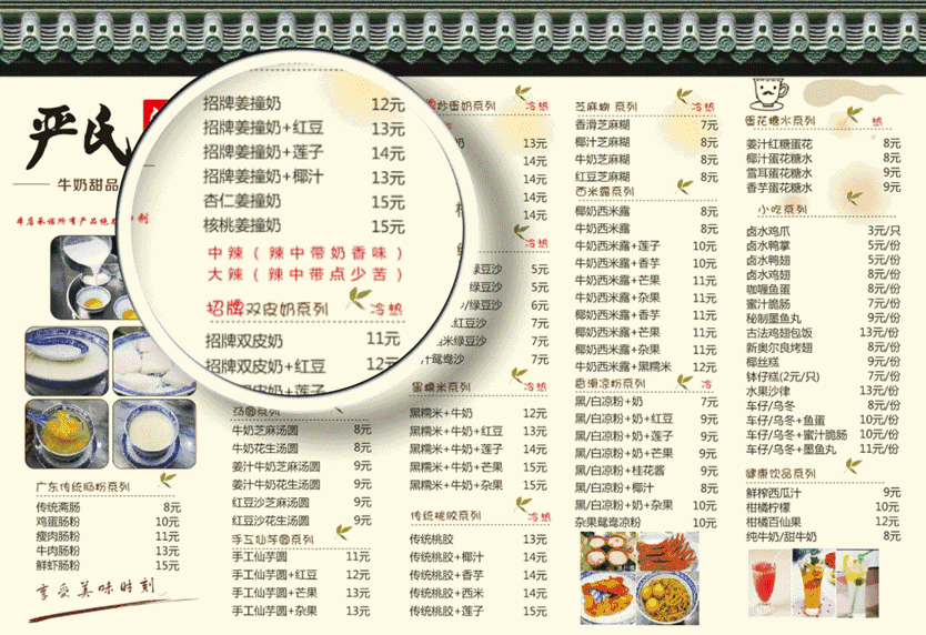 一进店就被墙壁上的壁画所吸引,充斥着浓郁的历史文化气息,描述着一个有故事的牛奶。也描述着广式的饮食文化~据说在广州糖水铺都是下午两点钟才开门的一直营业到凌晨。