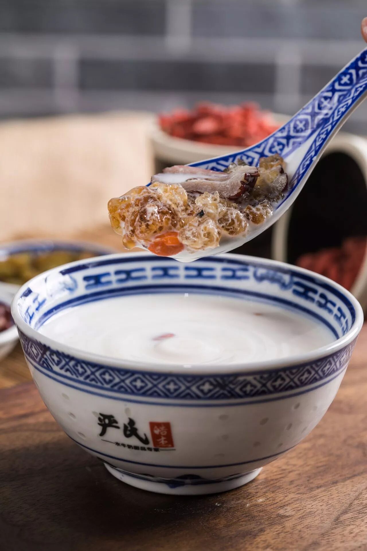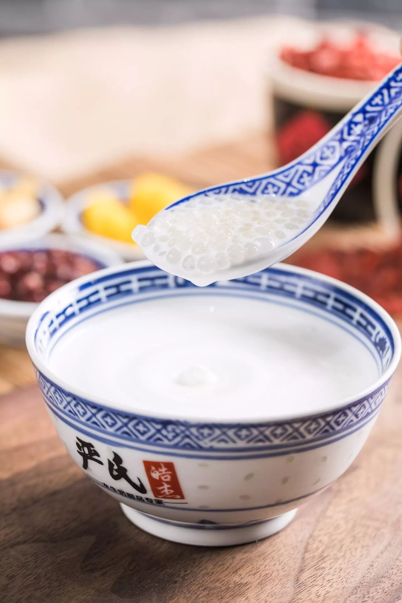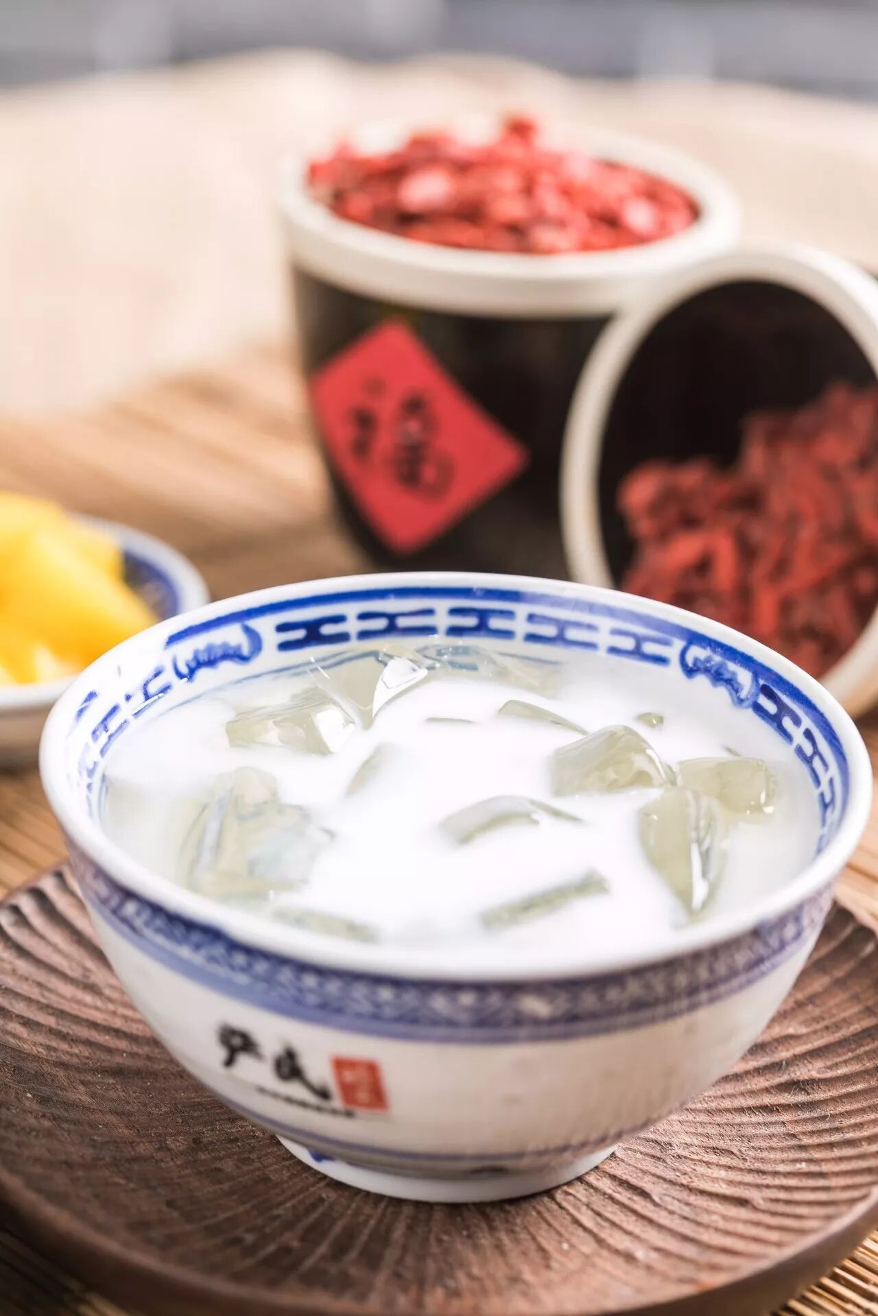 仿若果冻一般的“水晶”躺在青花瓷中,随着自己口味的喜好选择是否添加牛奶或者椰汁还有其他的辅料。