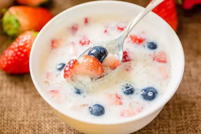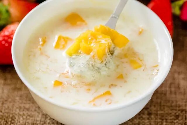 水果牛奶燕窝羹做法:牛奶+糖+鲜炖燕窝适量+超多水果!只要是你爱的水果!都放!随便放!