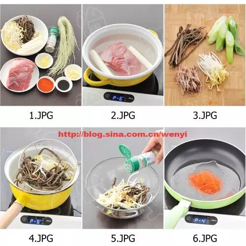 5)锅中倒入香油(30ml),调成小火,将辣椒粉倒入,慢慢炒出香味后,放入拌好的牛肉丝,蕨菜,豆芽,调成小火翻炒2分钟。