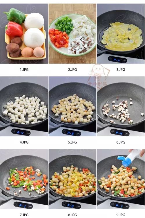 4)锅中留少许底油,放入香菇丁,炒软后,加入青红椒丁,炒30秒,再放入鸡蛋和煎好的馒头丁。加盐,白胡椒粉,炒匀盛出即可。