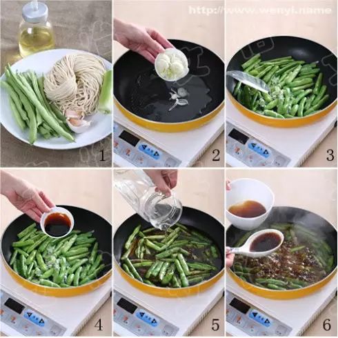 原料:扁豆200克,新鲜面条200克,葱1段,大蒜2瓣,酱油3勺(45ml),盐1/2茶匙(3克),清水适量