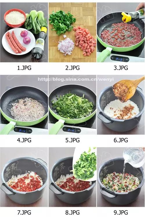 原料:腊肠3根,小干葱2头(或紫皮洋葱半个),油菜5根,大米200克