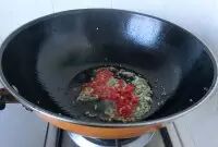 6.锅中留底油,下 葱、蒜、姜末炒香,再放入泡辣椒碎炒出香味后