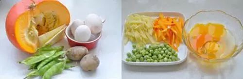 ②先将新鲜豌豆剥出,土豆切丝,南瓜要连皮切丝(皮的营养更为丰富),鸡蛋敲散。将豌豆在水中煮熟。