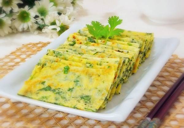 ③将鸡蛋饼翻面再煎熟即可(可以用一个大盘子扣在平底锅上,翻转锅使蛋饼放在盘子上,再将蛋饼推入平底锅中,如果觉得油不够可以再倒入一些油)。煎好的蛋饼切成块即可食用。