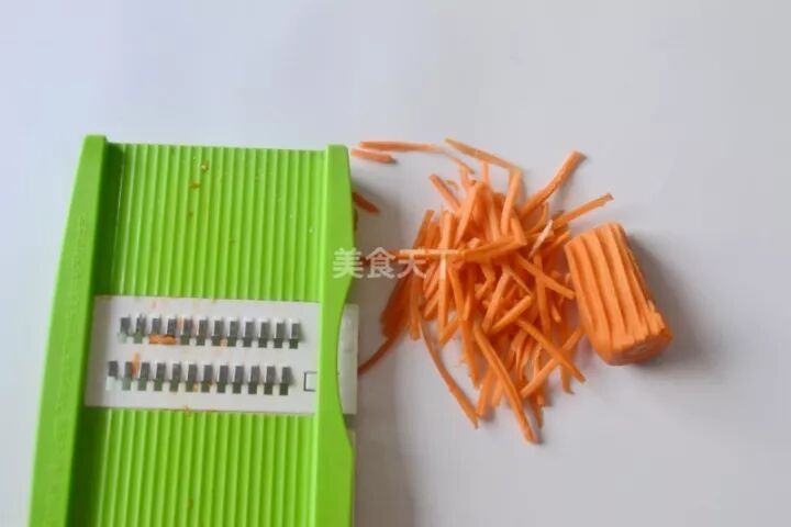 8. 捞起,然后放入凉水中冲洗下(这样炒制中不容易粘)9. 热锅热油爆香葱白后加入胡萝卜丝和香菇片翻炒均匀