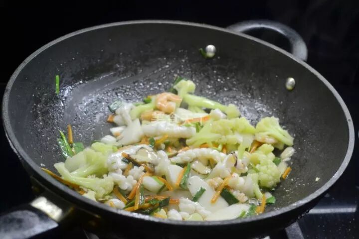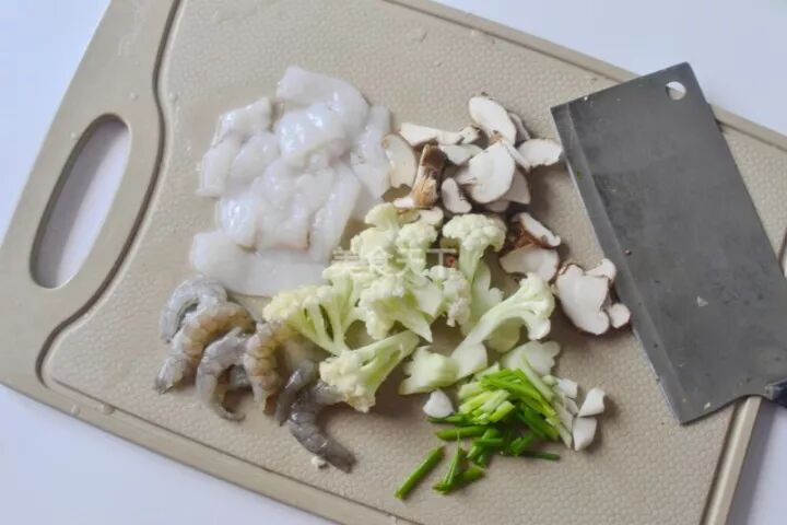 4. 虾去壳去肠线用盐抓拿腌制,鱿鱼洗净切花刀,鲜香菇切薄片,花菜掰小朵,香葱切寸断