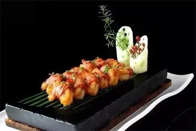 2、用培根把虾仁包卷好,再用牙签固定使其不散。逐一制完后,才放入加有色拉油并烧热的平底锅,随后以半煎半炸的方式制熟,沥油并抽去牙签,最后摆在垫有韭菜叶的石板上。