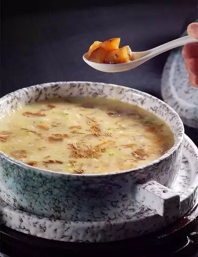1、先把竹毛肚涨发好,挤干水分后,再放到调成咸鲜味的高汤锅煨30分钟;另把黄金米加水煮熟了备用。