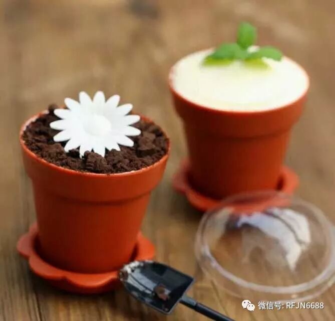 将巧克力慕斯做成小小盆栽样式,样式可爱,上面配2个绿叶,也是小朋友的最爱