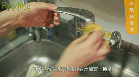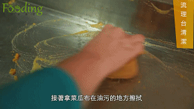 然后用制作好的橘子皮泥,涂抹到需要清洁的灶台上,用抹布擦拭第一遍后再用清水洗去泥垢。