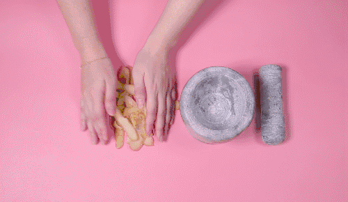 首先,把土豆皮洗净后放在蒜臼里捣成糊状。