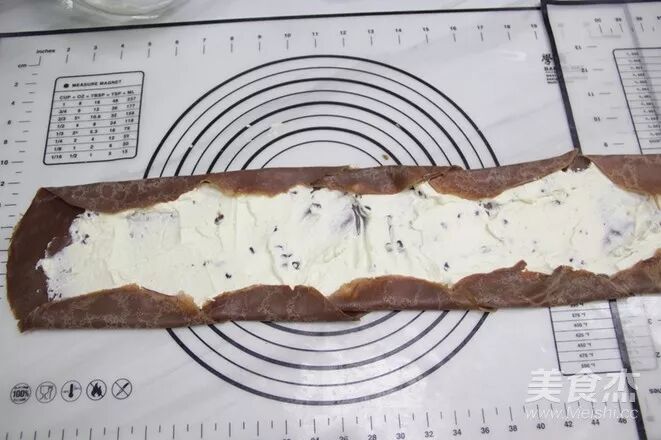 在班戟皮抹上一层淡奶油,用抹刀抹平,把上下圆的边折叠进来