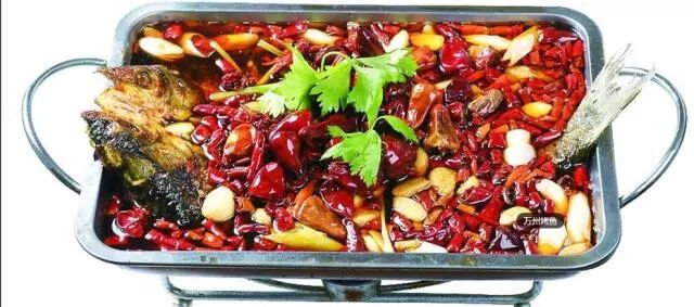 万州烤鱼是属于重庆特色传统名菜,属于渝菜系。万州烤鱼把鱼剖洗净后平放在铁夹中,放在炉上用木炭烧烤,盛到专用铁盘中,浇上用牛油、红油、白糖、花椒、辣椒等调味品炒出底料,放上西芹、豆芽等爽口菜。口味咸辣。万州烤鱼采用"先烤后炖"的独特做法,融合了烤、炖两种烹饪工艺的精华。