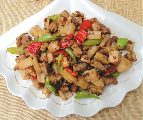 9、原锅刷干净,放火上烧热,加入少许油,先藕丁炒一炒,再放青红椒炒。
