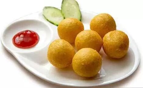 6)将奶酪包裹住,将土豆泥用手搓成小球状,放到面包糠里面