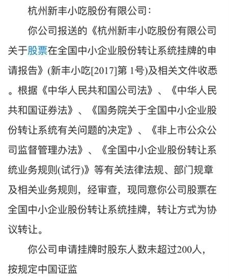 11月27日,新丰小吃收到了关于股转系统同意挂牌的函。