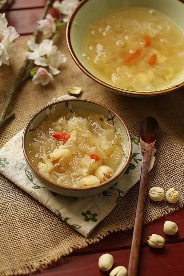 5.莲子易熟稍后放入,开锅后继续熬煮,直到银耳胶化,汤粘稠即可。