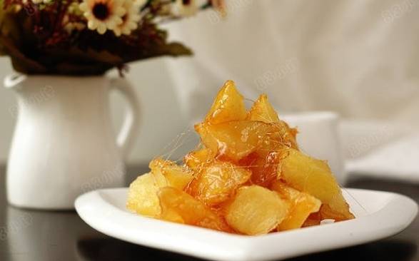 成品金黄香甜,挟取的时侯,有金丝拉出很是美妙。