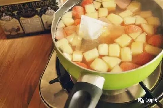 2、捞出果肉,加入茶包,盖盖子小火焖煮3分钟至出味。