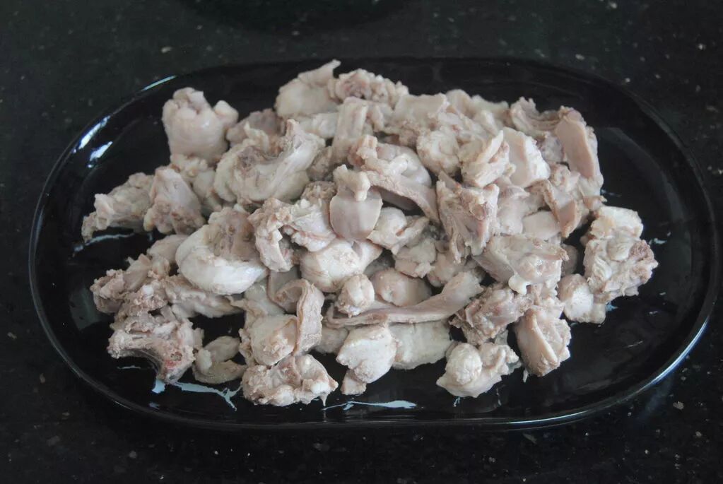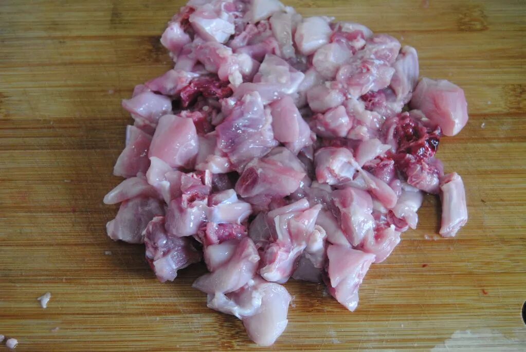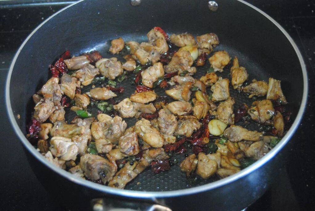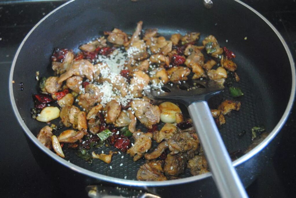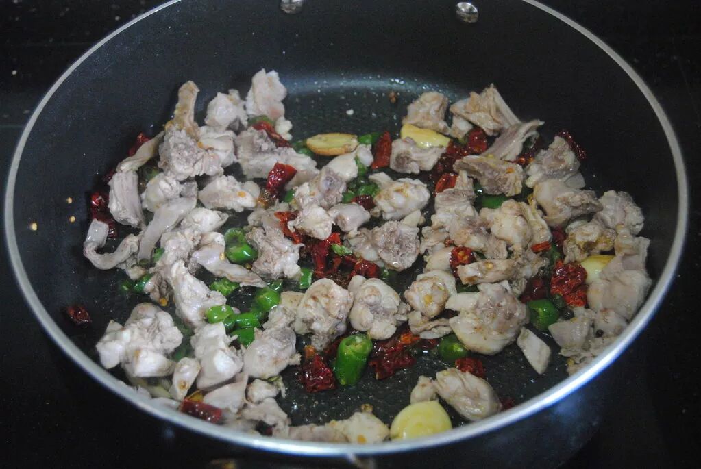 6. 倒入兔肉快速翻匀中火翻炒至肉稍变干