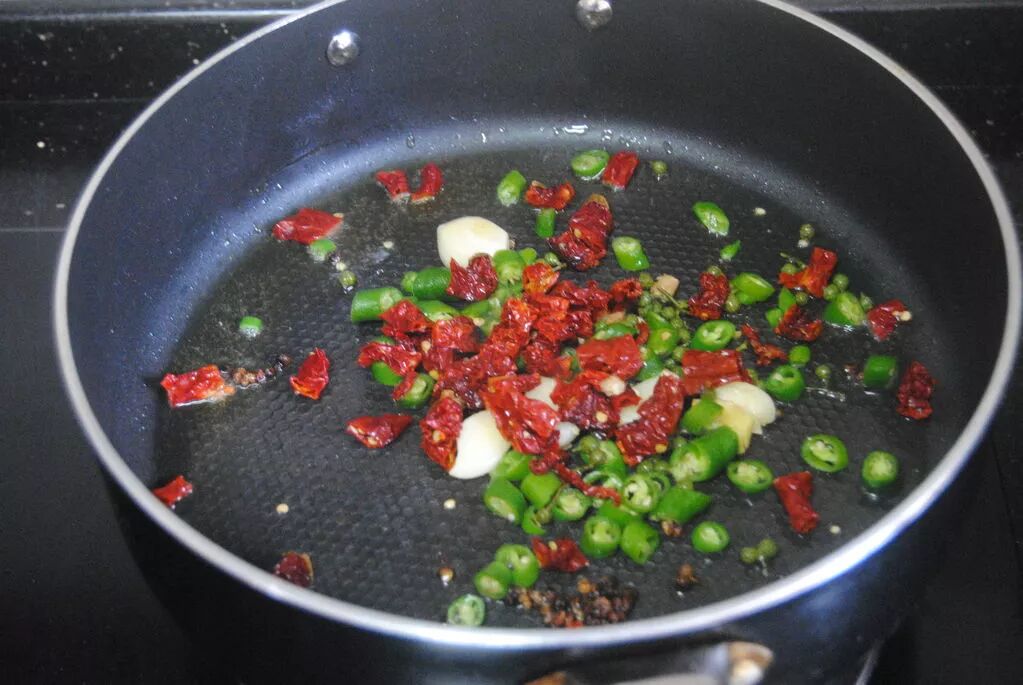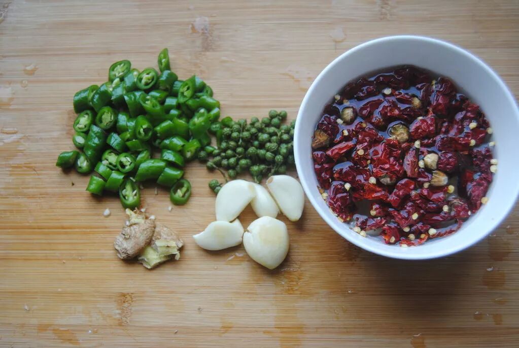 5. 热锅,放入姜片,大蒜,藤椒,花椒和两种辣椒爆香
